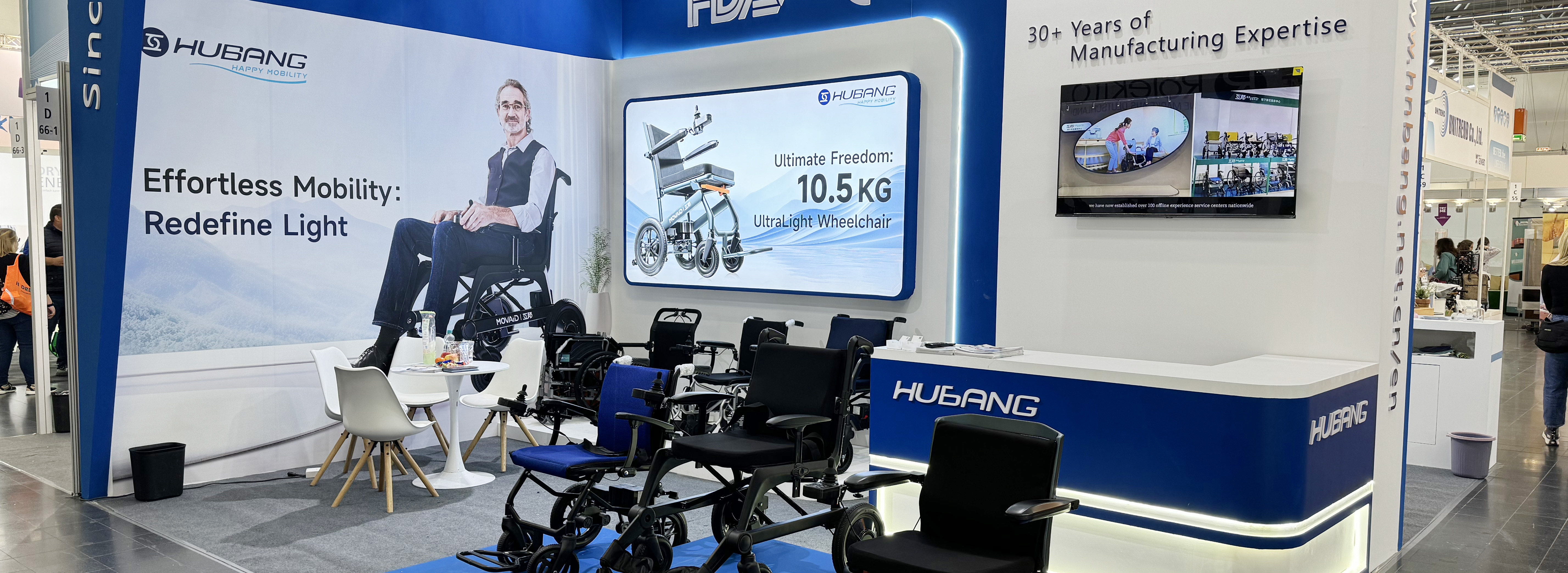 On May 14th, the 87th China International Medical Equipment (Spring) Fair (CMEF) with the theme of "Innovative Technology and Intelligent Future" was grandly opened at the Shanghai National Convention and Exhibition Center. Hubang unveiled its newly developed digital positioning tracking system and heavyweight new products at booth E22 in Hall 7.2, ushering in a new era of wheelchair digitalization.